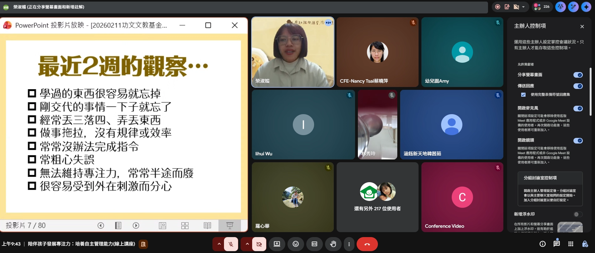 淑媚老師分享了4–12歲孩子的專注力發展歷程,說明不同年齡階段孩子的行為表現與需求差異,也提醒家長——「過多的限制,反而可能限制孩子的專注力發展」,引導家長重新思考教養方式,學習在適當的引導與支持中,讓孩子逐步建立專注與自我管理能力。