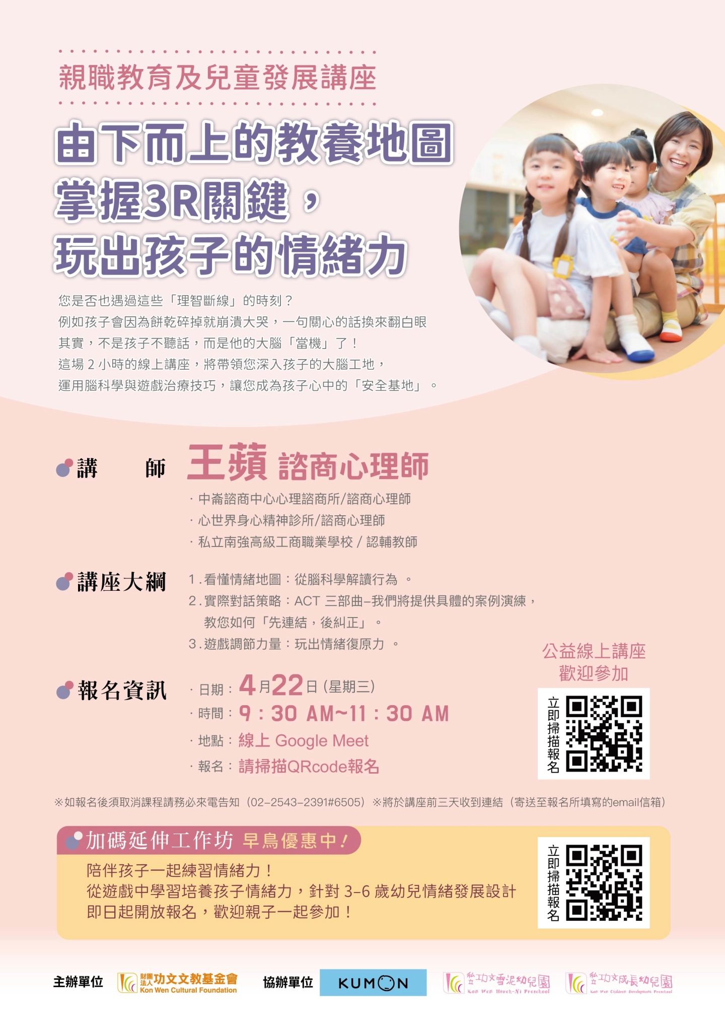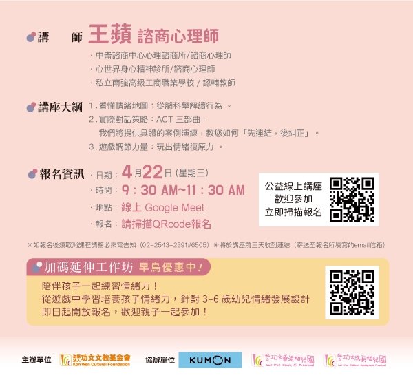 這場 2 小時的線上講座,將帶領您深入孩子的大腦工地,運用腦科學與遊戲治療技巧,讓您成為孩子心中最穩定的「安全基地」。