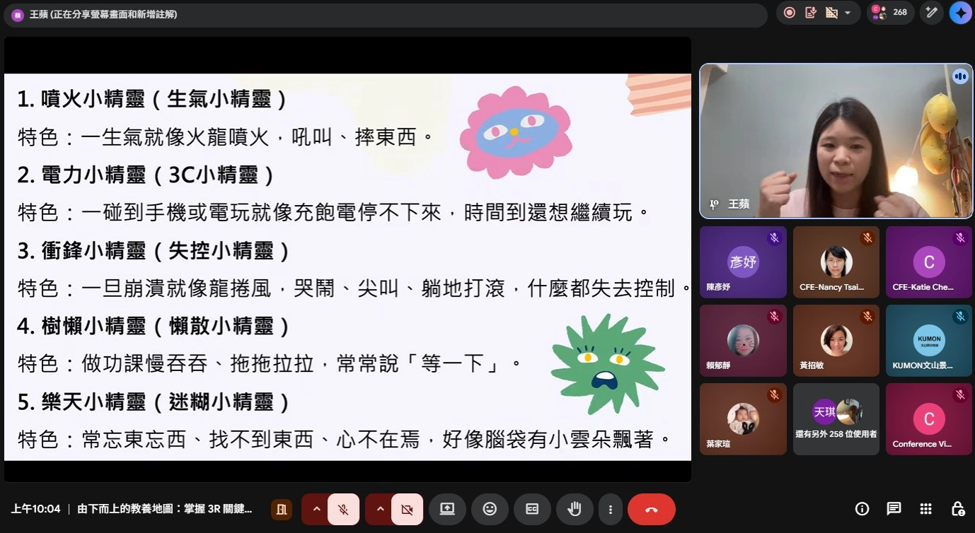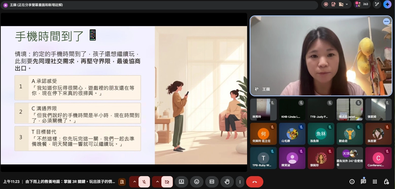 在實務教養策略上,講座提出「3R情緒調節法」(Regulate、Relate、Reason),強調先穩定情緒、再建立連結,最後才進行引導與討論;並結合ACT對話技巧(Acknowledge、Communicate、Target),協助家長以更具結構性的方式回應孩子情緒行為。 -