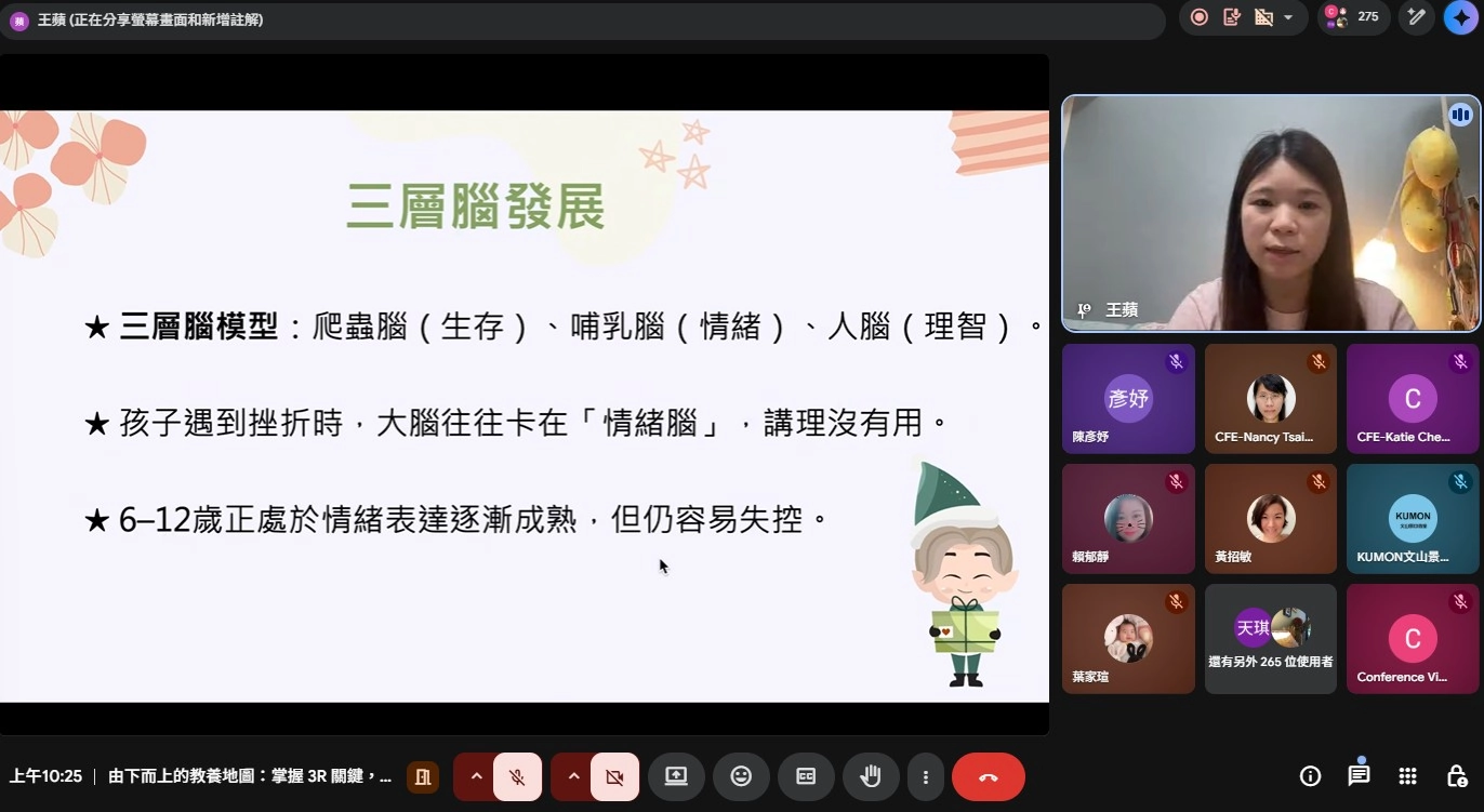 在腦科學部分,講座介紹0–12歲大腦發展關鍵期,說明情緒與大腦運作的密切關聯,並以三層腦理論(爬蟲腦、情緒腦、理智腦)解釋孩子在情緒失控時的內在狀態,強調此時進行說理往往無效,孩子更需要的是安全感與穩定的回應。 -