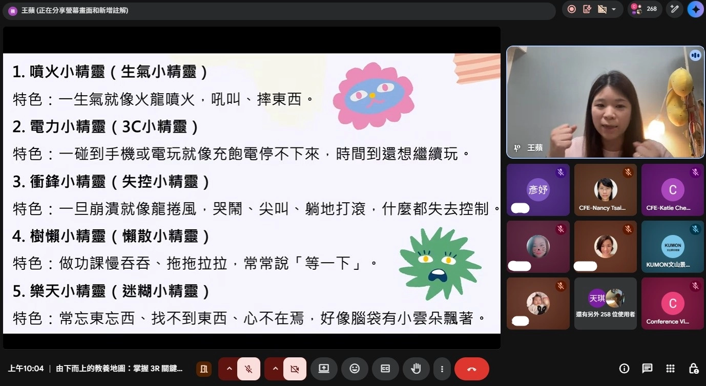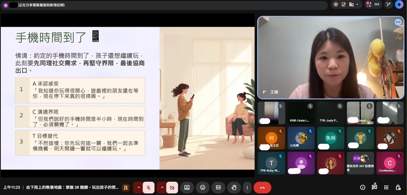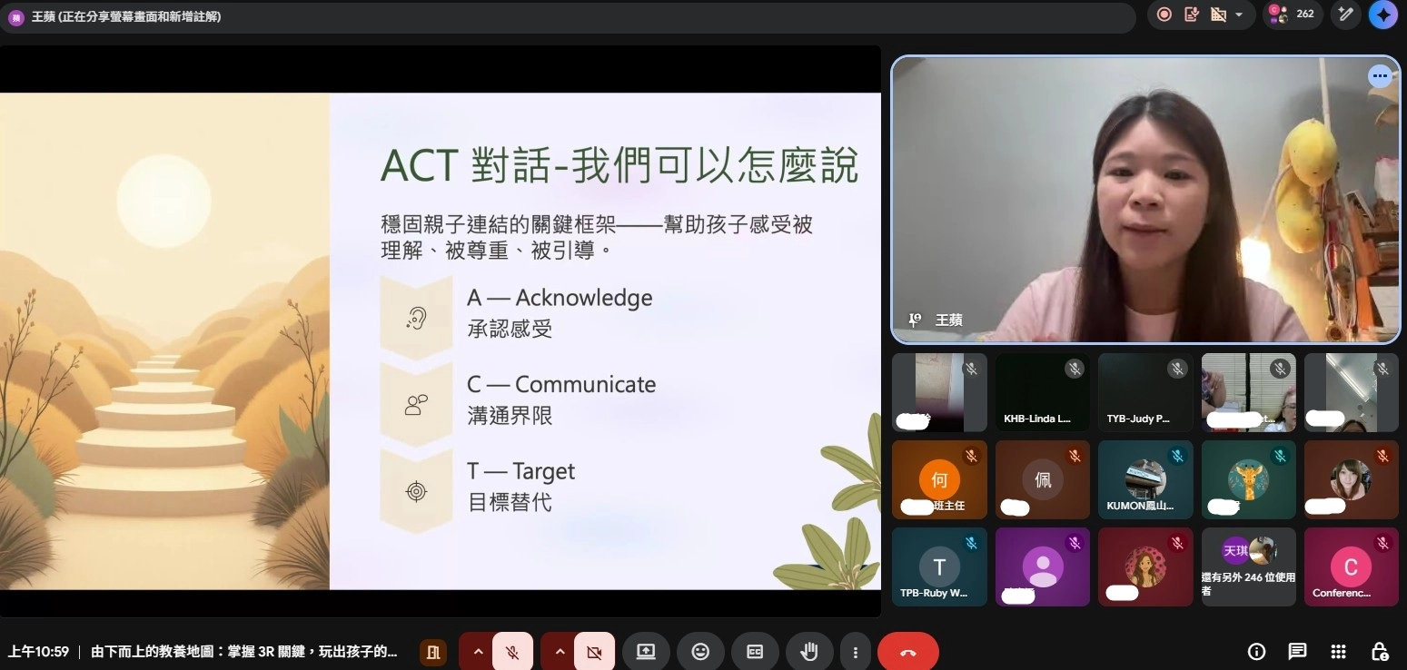 在實務教養策略上,講座提出「3R情緒調節法」(Regulate、Relate、Reason),強調先穩定情緒、再建立連結,最後才進行引導與討論;並結合ACT對話技巧(Acknowledge、Communicate、Target),協助家長以更具結構性的方式回應孩子情緒行為。 -
