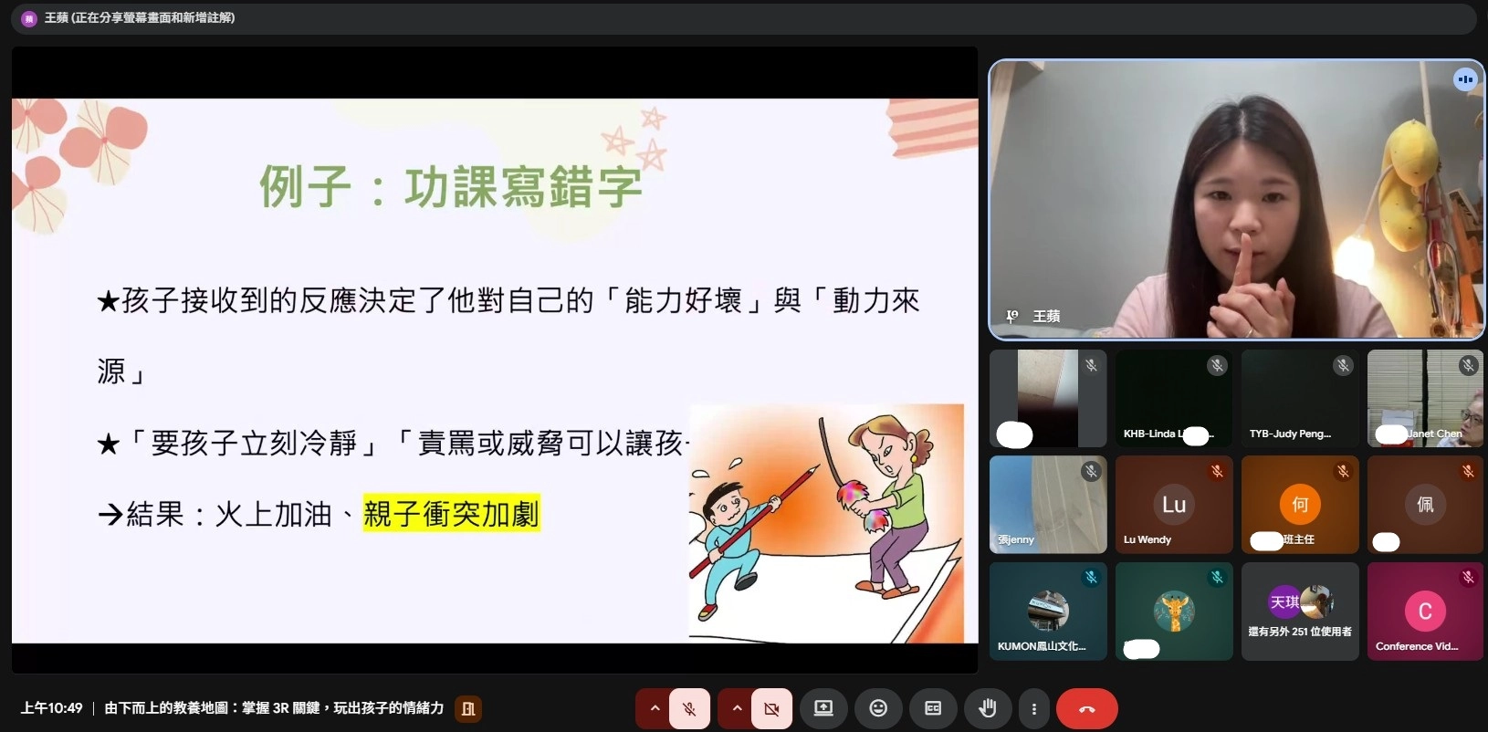 講座首先從日常情境切入,帶領家長觀察孩子常見的情緒表現,如不耐煩、拒絕與衝突性語言,並指出孩子的情緒並非「問題行為」,而是發展中的自然反應。情緒的形成來自大腦發展、依附關係與社會學習三大因素,孩子並非刻意「鬧情緒」,而是在其發展階段中以既有能力回應環境。