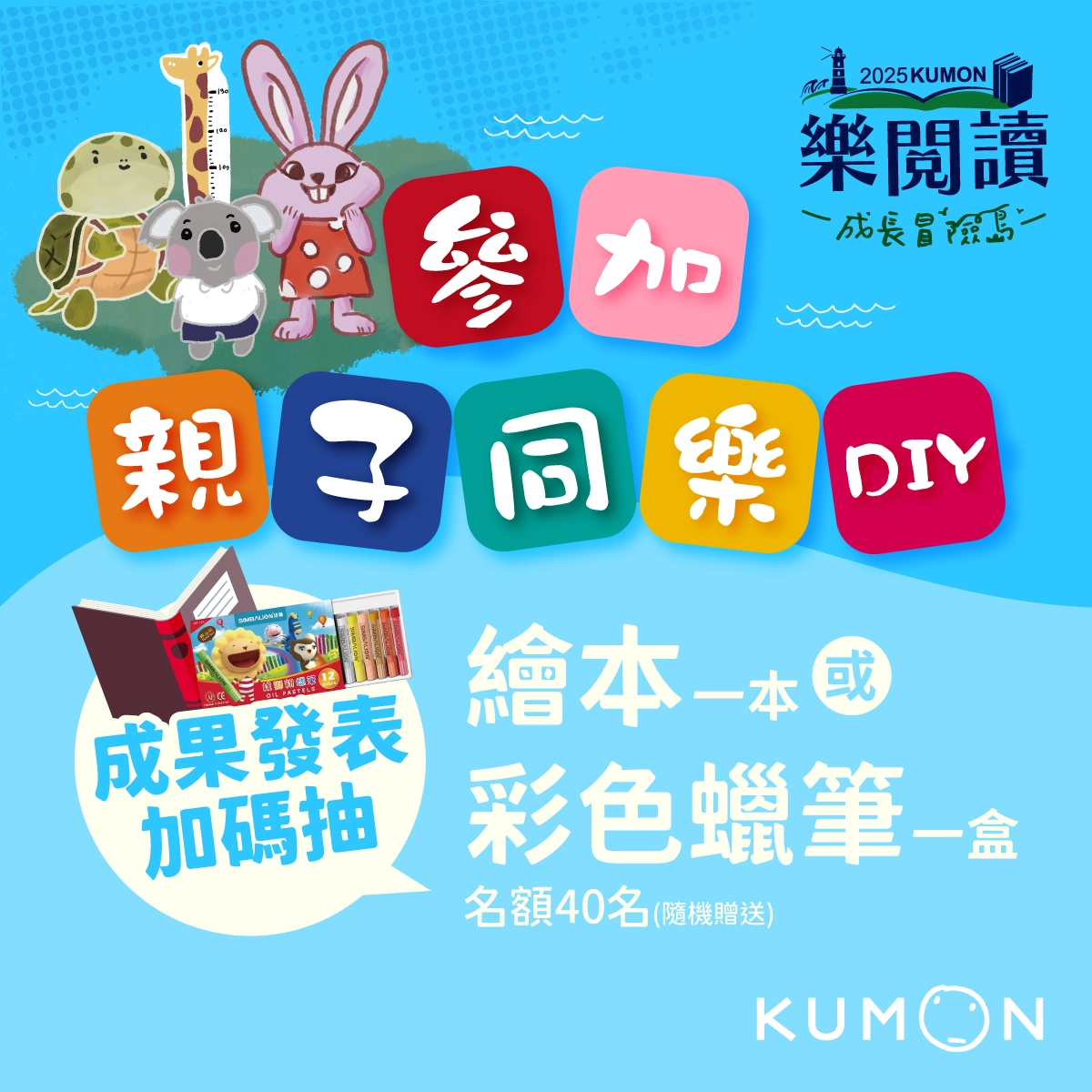 參加「樂閱讀」活動後,還意猶未盡嗎?只要至KUMON(臺灣孔孟)的Facebook文章留言分享孩子朗讀「KUMON國語教材」(任意一篇、長度不限)或《樹懶豆豆的新朋友》的影片,就有機會參加抽獎!