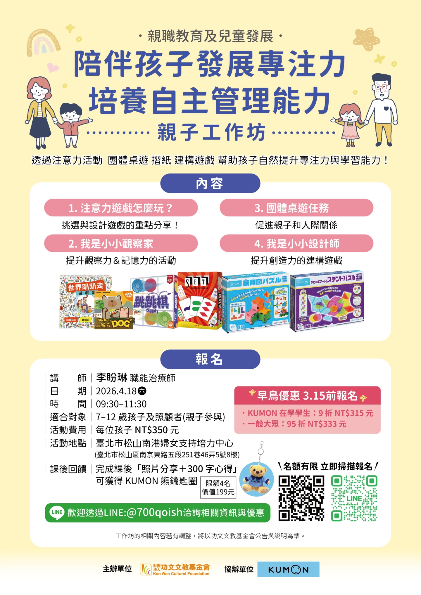 - 主題《陪伴孩子發展專注力:培養自主管理能力 親子工作坊》
